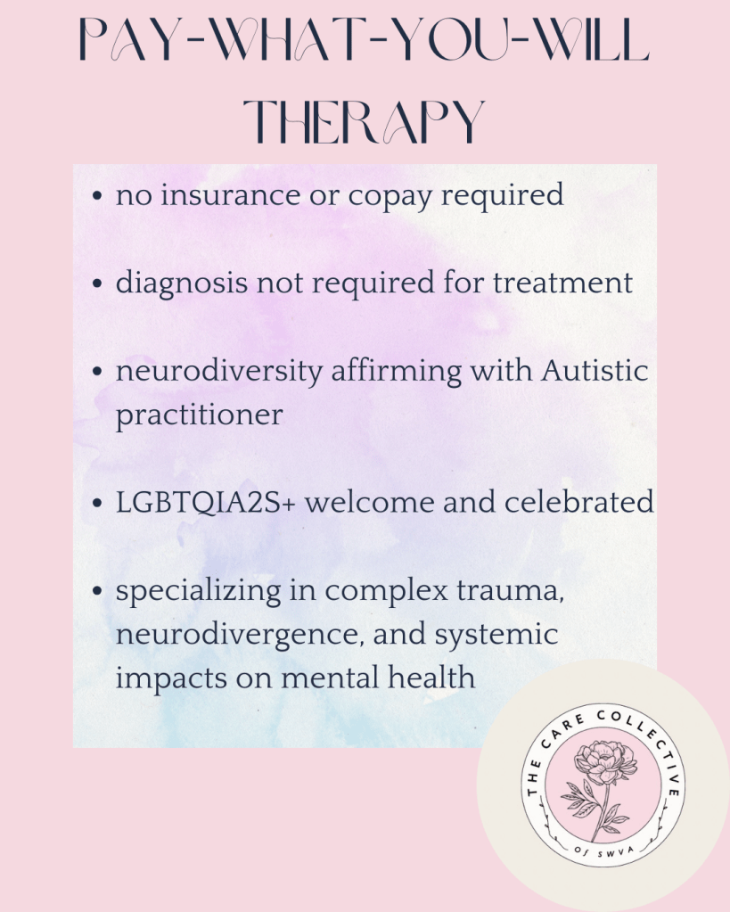 Your therapy through The Care Collective is pay what you will: this means that no one will be turned away for their inability to pay, and that we do not want anyone to struggle because they are choosing to prioritize their mental health.